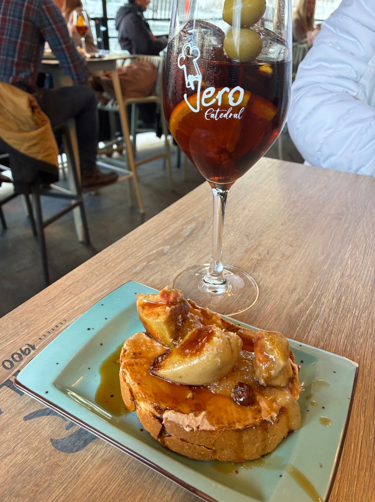 Un poco más adelante, por la calle Cascajales, llegamos a Jero Catedral. Ya conocíamos el local de la calle Correos, pero esta vez probamos la terraza de su local en la calle Arribas, esquina con Cascajales. Aquí disfrutamos del canapé Navideño, una combinación de mousse de foie, mermelada de manzana, foie fresco a la plancha y reducción de PX con pasas. Es difícil que algo así salga mal, y efectivamente fue un acierto seguro: una pequeña maravilla en cada bocado que mantiene la esencia y creatividad que caracteriza a Jero.